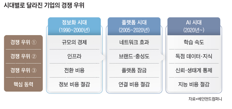 시대마다 경쟁 기반은 달라져 왔다. 1990~ 2000년대 정보화 시대에는 규모의 경제와 인프라 경쟁력이, 2005~2020년 플랫폼 시대에는 네트워크 효과와 플랫폼 기반으로 한 고객 록인(lock-in)이 승패를 갈랐다.