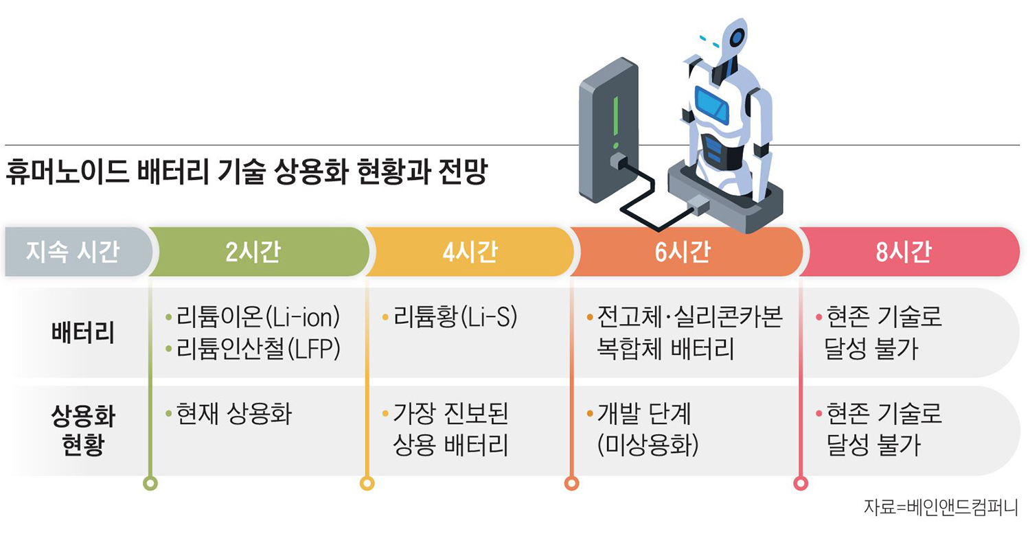 가장 근본적인 제약은 전력이다. 현재 리튬이온·리튬인산철 배터리 기반으로 휴머노이드가 연속 가동할 수 있는 시간은 약 2시간에 불과하다. 제조 현장 기본 단위인 8시간 교대 근무를 충전 없이 소화하려면 배터리 에너지밀도가 현재의 네 배 수준까지 올라야 하는데, 이는 현존하는 기술로는 불가능하고 최소 10년 이상의 시간이 필요하다. 그전까지는 교체식 배터리나 급속 충전 인프라에 의존할 수밖에 없다. 결국 ‘8시간 무충전 교대 근무’라는 산업 현장의 기본 요건을 충족하기까지는 상당한 시간이 걸리며, 그 간극을 메우는 운영 전략이 로봇 도입 성패를 가를 핵심 변수가 된다.