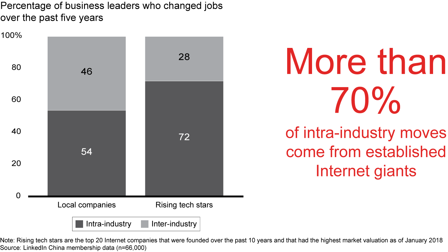 Industry-based talent pools. While most industries poach talent from other industries, the rising tech stars frequently trade talent from within their sector. More than 70% of rising tech star leaders made career transitions within the same industry. Of the intra-industry career moves, nearly 80% involved leaders leaving established Internet companies to join newer ventures (see Figure 8).
