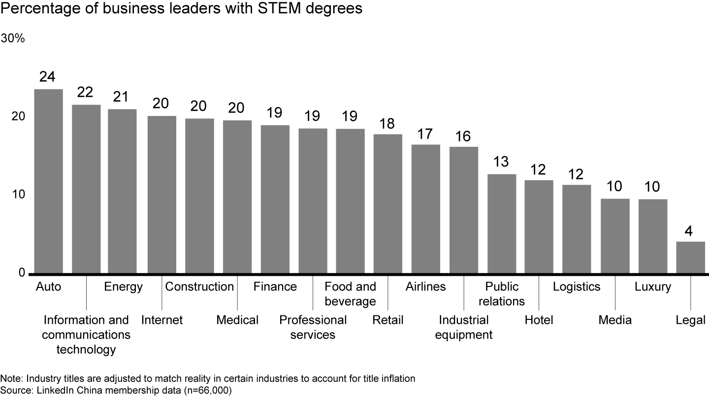 In China, nearly 20% of business leaders have a science, technology, engineering or mathematics (STEM) degree, with variation across industries
