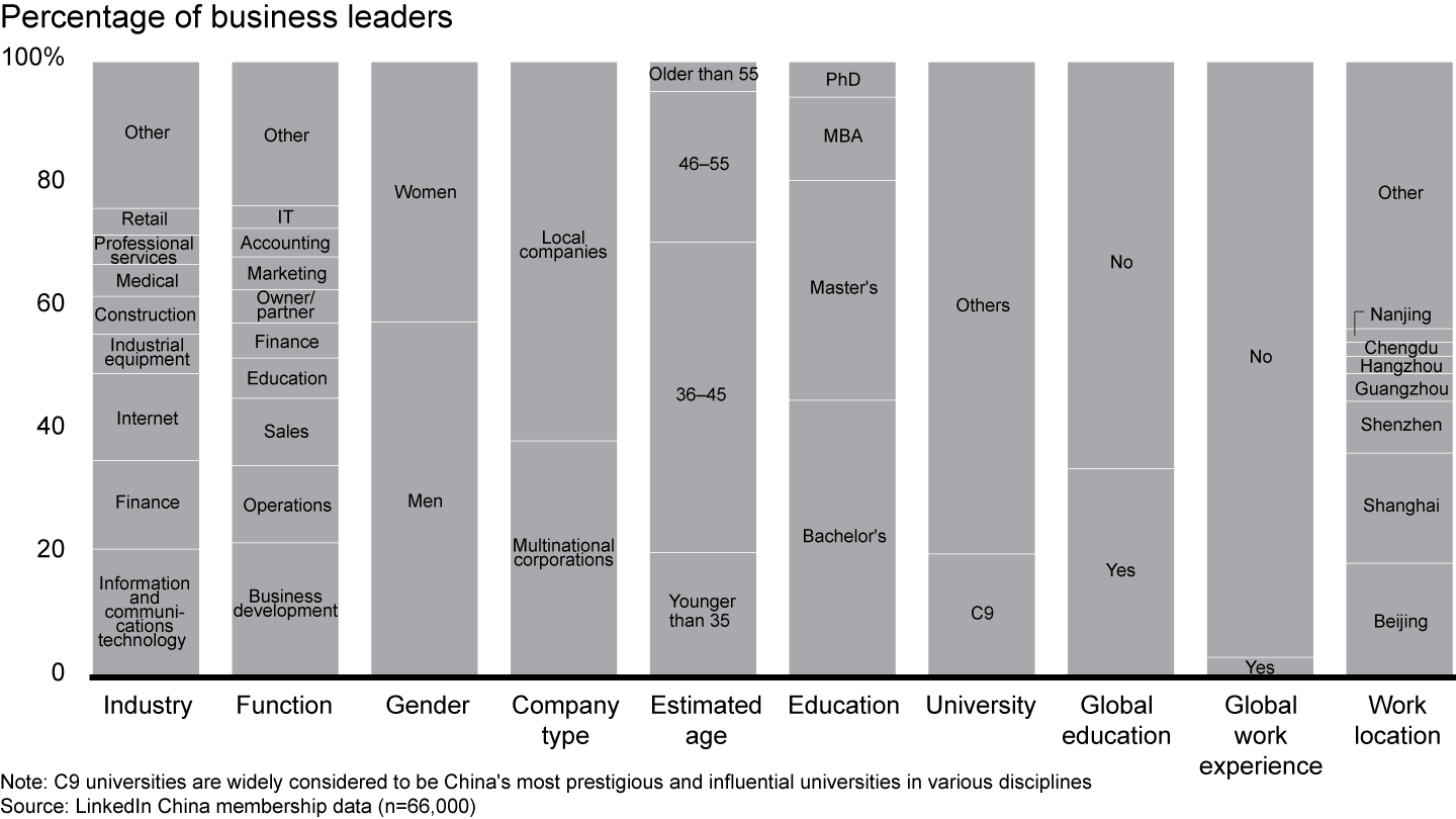 Analysis for this report is limited to Chinese business leaders who use LinkedIn to self-report their employment status and history. Similar to any study that uses self-reported responses, our research relies on the accuracy and timeliness of users’ LinkedIn profiles.