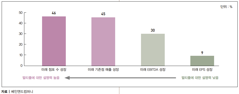 <도표 1>은 기업 가치와 미래 점포 수 성장, 기존점 매출 성장, EBITDA(상각 전 영업이익) 성장, EPS(주당 이익) 성장의 4가지 지표 간 상관관계를 분석한 것이다. 왼쪽으로 갈수록 기업 가치를 설명하는 설명력이 더 높다는 것을 알 수 있다. 과거에는 미래 점포 수 성장 즉, 점포를 얼 마나 더 추가 출점 할 수 있는가에 관심이 높았다. 물론 미래 점포 수 성장은 여전히 유의미한 지표이지만, 그만큼 중요해진 것이 기존점 매출이 앞으로 얼마나 더 성장할 것이냐다. 두 지표 간 격차가 점점 줄고 있다. 점포 수를 기반으로 성장해온 편의점 마저도 이제 점당 매출이 중요 해진 시기가 왔다. 여기서 기존점은 신규 출점 후 1년이 경과한 점포로 이해하면 된다. 기존점이 얼마나 가치와 매출을 창출하는가는 기업 가치를 설명하는 데 중요한 지표 중 하나다.