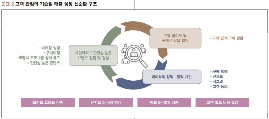 <도표 2>와 같이 선순환 구조를 만들어야 한다. 우선 더 많은 거래와 더 많은 고객의 인게이지먼트를 확보하는 것에서 출발한다. 그래서 베인에서는 기존점 매출을 증대시키기 위한 성장 전략의 첫 번째 시작점을 고객으로 본다. 고객이 얼마나 많이 방문하게 할 것인가에 대한 고민으로 시작해 고객을 많이 유입시키며, 양질의 고객 데이터를 축적해야 한다. 다음은 이 데이터를 기반으로 보다 더 개인화, 맞춤화된 마케팅을 시행해 고객의 재방문을 촉진한다. 그러면 점당 매출 특히 기존점 점당 매출을 상승시키는 선순환 구조를 구축할 수 있다.