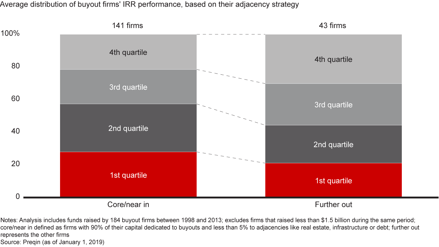 To test this point, we looked at a sample of funds launched between 1998 and 2013 by 184 buyout firms for which we had performance data, each of which had raised at least $1.5 billion during that period. We found that, when it comes to maintaining a high level of returns, staying close to the core definitely matters. Our study defined “core/near-in” firms as those that dedicated at least 90% of their raised capital to buyouts and less than 5% to adjacencies (including infrastructure, real estate and debt). We compared them to firms that moved further away from the core (dedicating more than 5% to adjacencies). The results: On average, 28% of core/near-in firms’ buyout funds generated top-quartile IRR performance, vs. 21% for firms that moved further afield (see Figure 2.14).