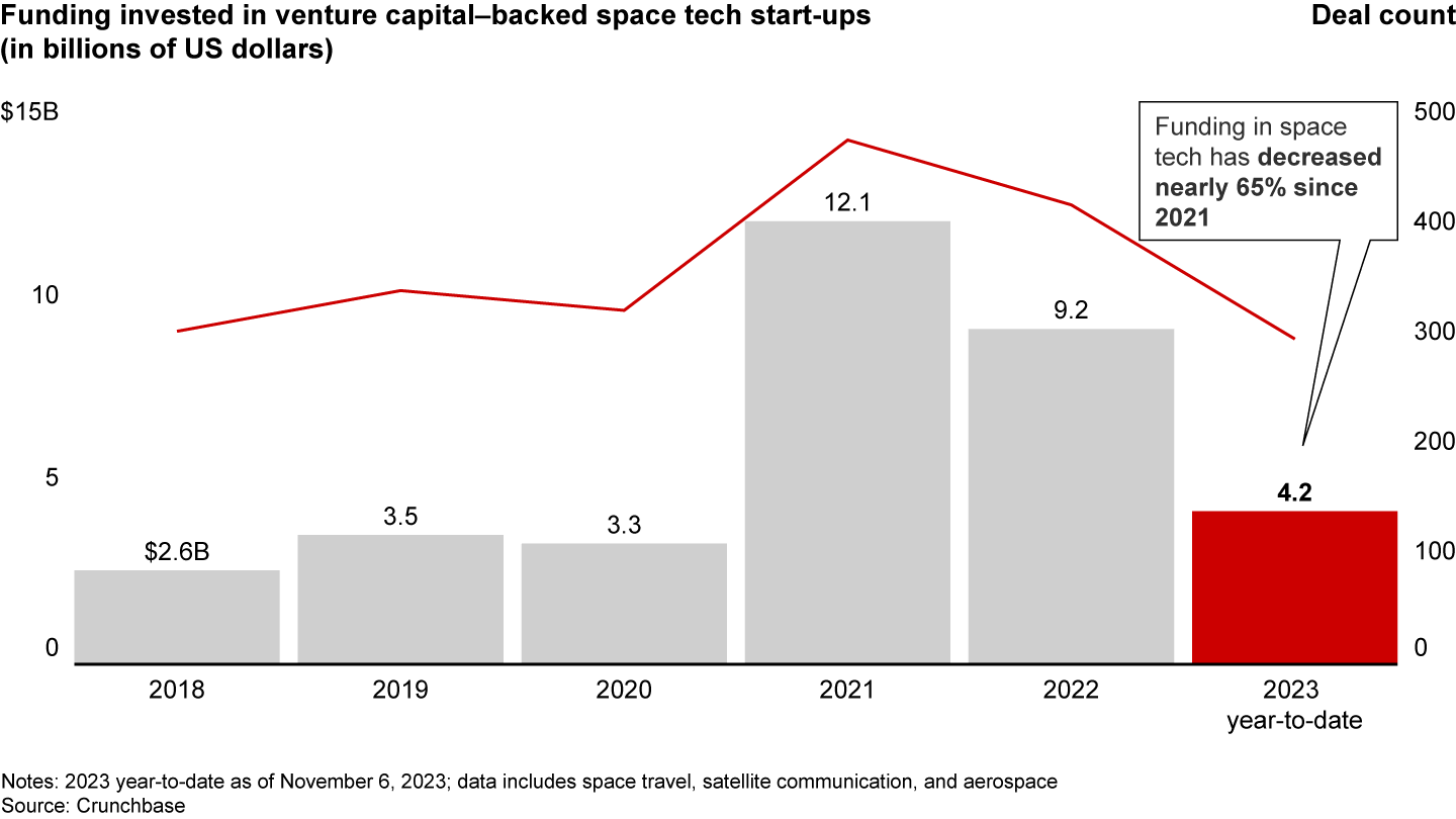 Space tech is getting less funding. The year 2021 set a record in space funding, with more than $12 billion invested in space companies. In 2022, that amount dropped to $9 billion, and then the first three quarters of 2023 brought that investment total significantly lower, to only $4.2 billion (see Figure 2). Many space companies that went public in recent years continue to struggle, with most performing below their initial listing price, and many receiving letters of impending delisting.