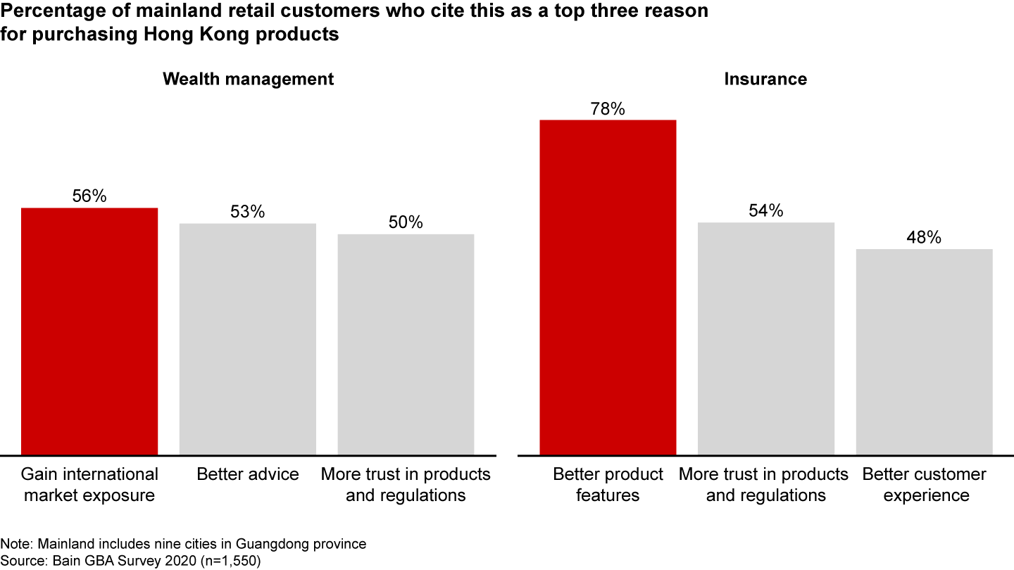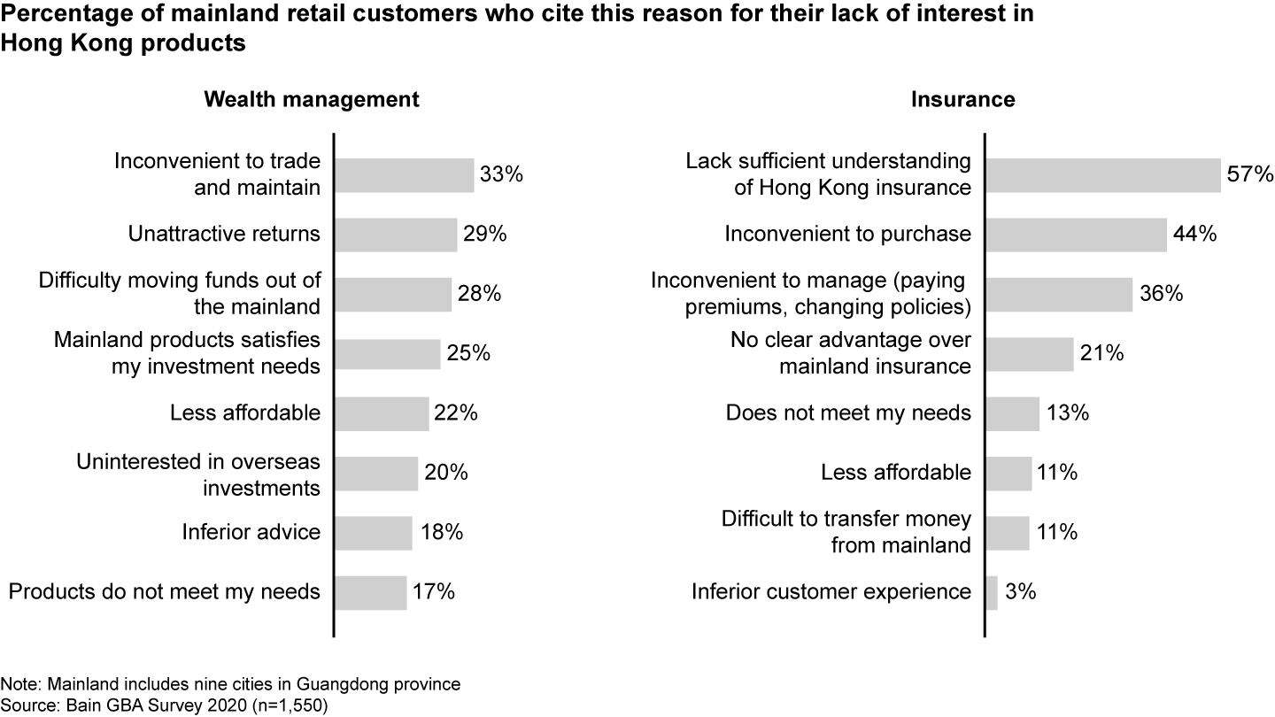 Among mainland retail respondents not interested in cross-boundary insurance, most indicate that they do not adequately understand Hong Kong insurance products, suggesting that insurers can further educate customers about their offerings. In wealth management, those not interested in Hong Kong products cite unattractive returns as a reason, and some feel mainland options already meet their needs (see Figure 4). This points to an opportunity for further product differentiation of Hong Kong products and tailoring to mainland customer needs.