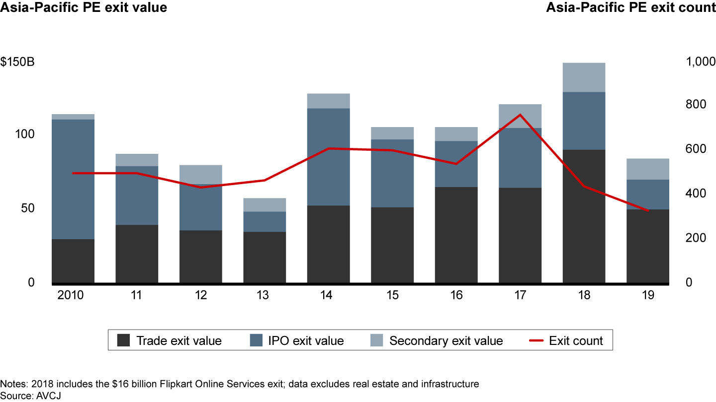 Beyond the contraction in Greater China—and perhaps more worrying—the sharp drop in exits across the region meant that cash flow for limited partners (LPs) in late 2018 and 2019 was negative for the first time since 2013. General partners (GPs) already had trimmed their portfolios in 2018 when exit values hit a record high, but an uncertain macroeconomic outlook, tepid M&A activity and an erratic stock market also discouraged funds from pursuing exits.