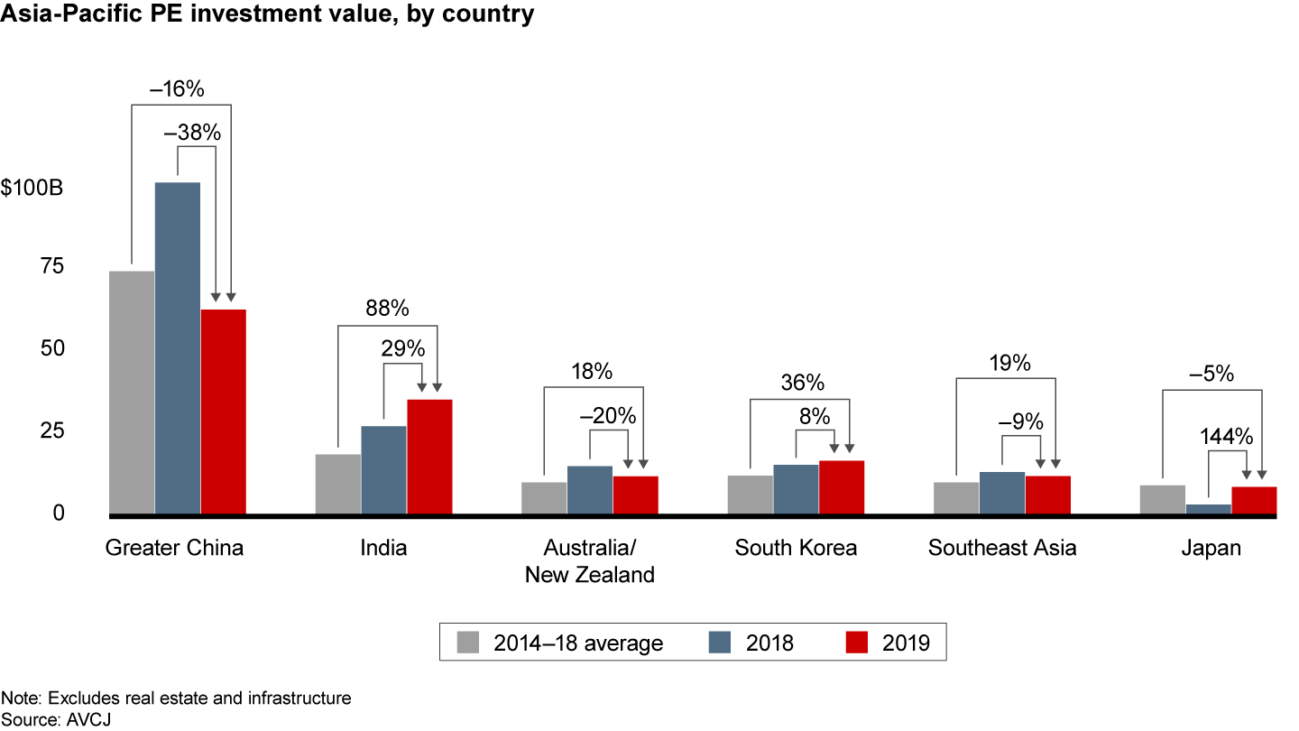 After roaring ahead in 2017 and 2018, Asia-Pacific private equity (PE) investment declined year-on-year as the region’s largest market, Greater China, slumped. There, the boom that produced record deal value for two years running ended abruptly: Deal activity and exits plunged, pulling down the region’s performance. In all other geographies, by contrast, investment grew or was on par with the average of the previous five years.