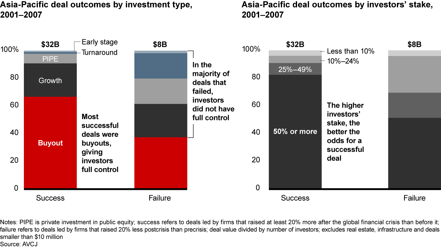 What sets the winners apart from the rest? To answer that question, we analyzed around 2,500 Asia-Pacific deals and 1,280 exits from 2001 to 2007 that were greater than $10 million, excluding real estate and infrastructure. Our analysis of fund performance revealed several vital insights about how investors can survive and thrive in a downturn. Specifically, successful funds understand four important truths about the market: