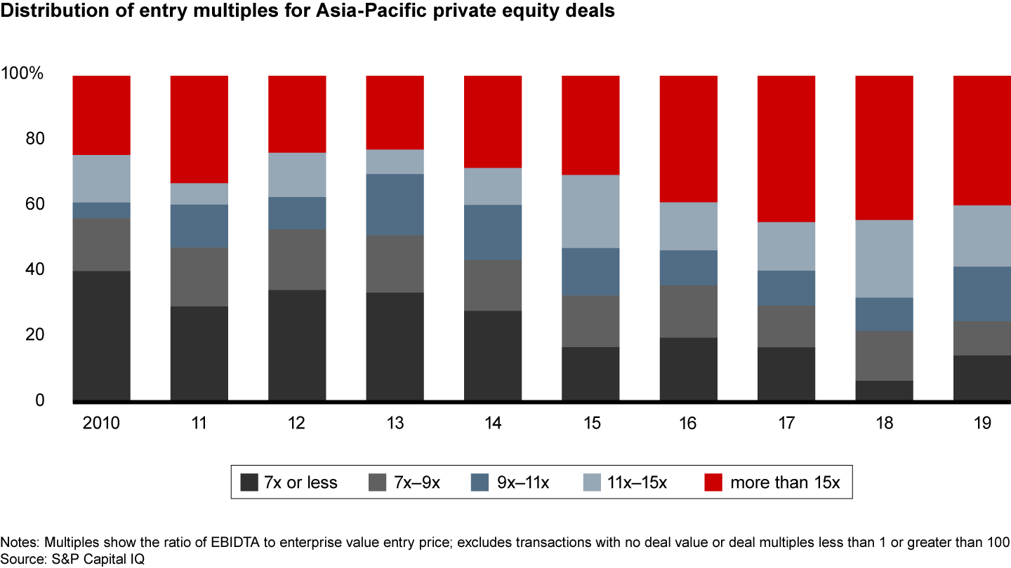 In addition to the macroeconomic challenges, record-high multiples risk making it harder for funds to sustain returns if they start to decline. Since 2016, more than 40% of Asia-Pacific PE-backed deals had an entry multiple higher than 15, compared with 25% to 30% from 2010 to 2015 (see Figure 3.2).