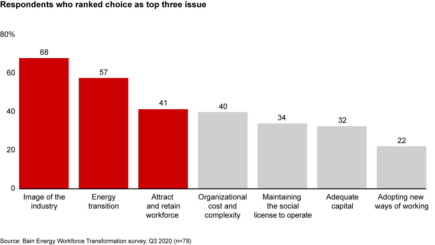 Challenges in recruiting new talent. The traditional approach to hiring new talent in energy and natural resource companies is to target engineers for many roles, including entry level and more senior positions. Here’s where the math gets tricky: Women account for less than 30% of the science, technology, engineering, and math (STEM) labor force in the US and about 15% of engineers. At the same time, many energy and natural resource companies want to recruit more women, indicating greater demand for female engineers—but with no new talent pipeline. Reaching gender parity, if continuing to pull from that same talent pool, would require growing the percentage of women in engineering by three times, which is orders of magnitude above what has been accomplished over the past few decades.