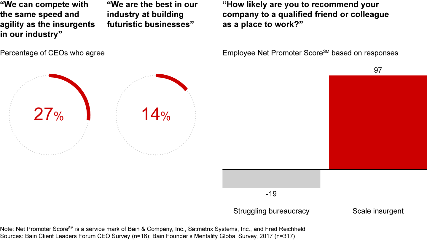 And in a world of more competition for customers and talent, the journey to scale insurgency has never been more important. Only a quarter of incumbent CEOs feel their company can move as quickly as insurgents, and only 14% feel they can build industry-dominating future businesses (see Figure 1). In addition, almost 100% of employees at scale insurgents would recommend their company as a place to work, while employees of bureaucracies are telling others to steer clear.