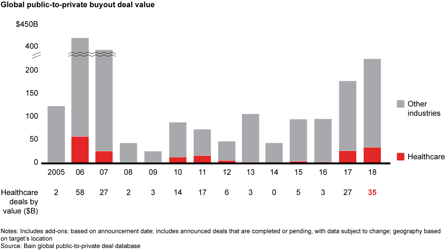 The value of public-to-private buyouts reached the highest level since 2007, while the value of healthcare take-privates rose to $35 billion in 2018