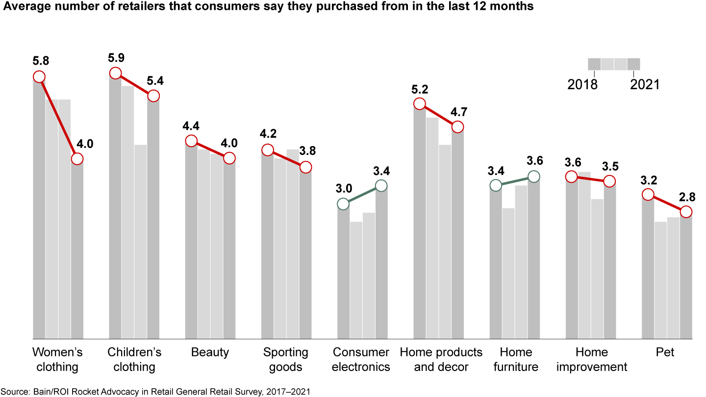 The shift toward more purposeful shopping is explained, in part, by a longer-term trend of narrower shopper repertoires, or the number of retailers that consumers shop from regularly in a given category. Research we’ve conducted with ROI Rocket over the past several years suggests that shoppers were already reducing the number of retailers they purchased from prior to the pandemic (see Figure 4). Relative to 2018, shoppers have reduced their repertoire in seven out of nine categories this year.