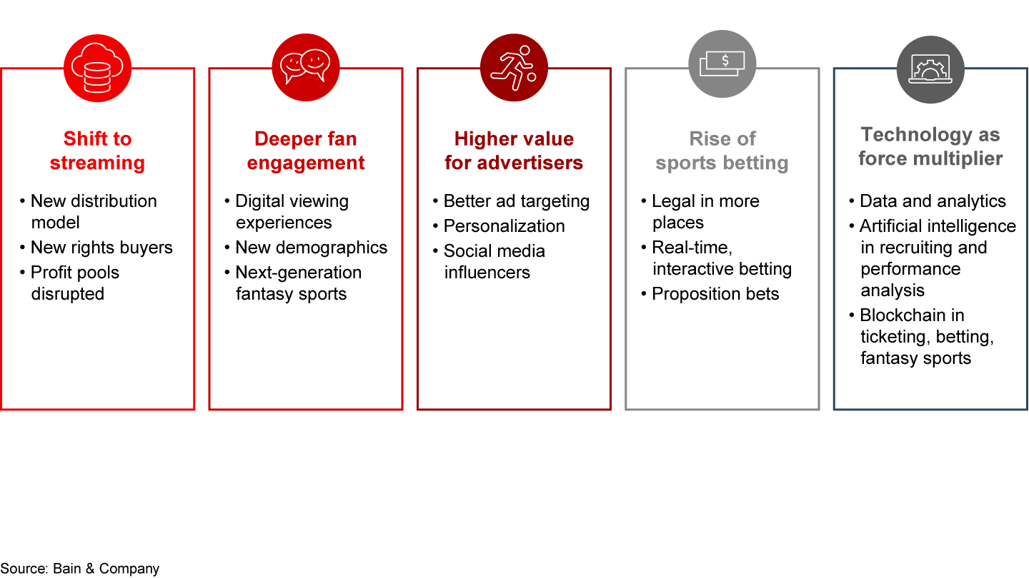 New investment and ownership are just two among the many pressures that are rapidly changing sports (see Figure 2). The migration from broadcast to streaming, the rise of digital experiences (including Esports), technologies that allow for deeper fan engagement, and the rise of online betting in some markets are all changing the ways in which fans engage with their favorite teams and players as well as how that engagement is monetized.