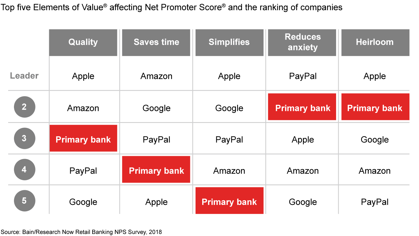 Large technology firms have the cash, digital expertise, consumer trust and strong performance in core Elements of Value to make further inroads into banking services. However, some banks have successfully defended their position by reorganizing how customers experience their products and services.