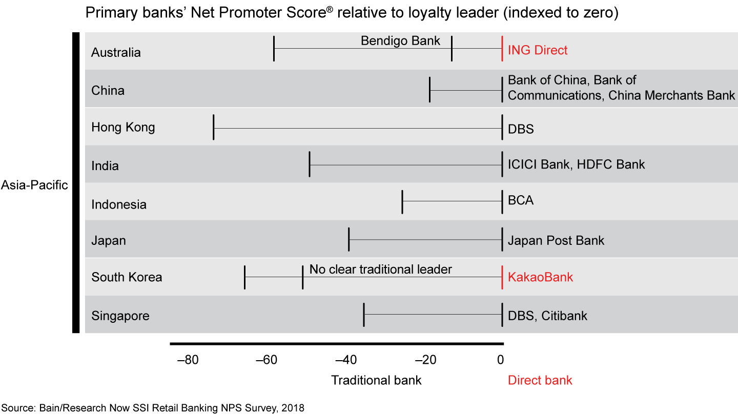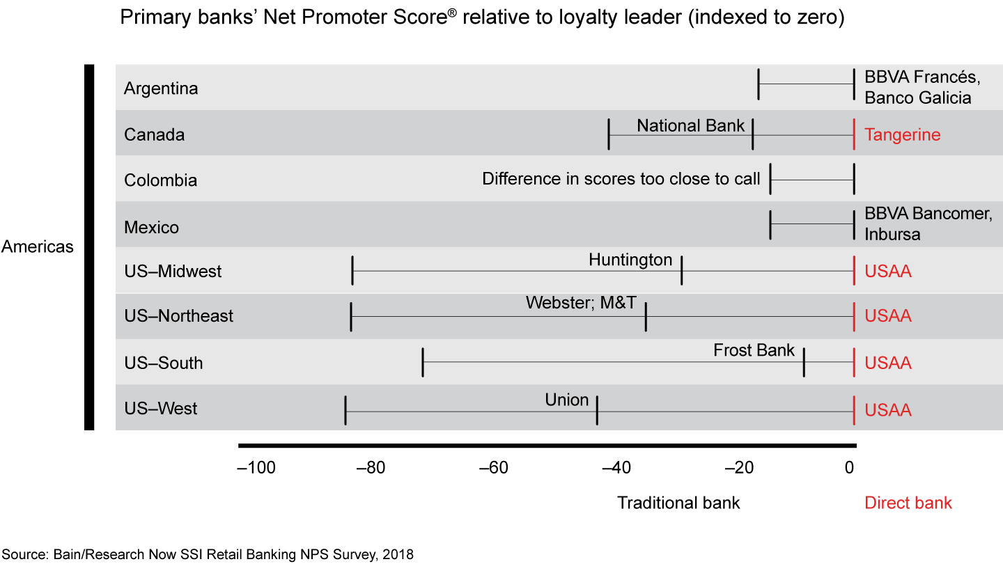- There are several paths to loyalty leadership. A traditional bank might earn a high Net Promoter Score largely because of excellent service in its branches and call centers, whereas customers of direct bank might cite the simple, straightforward app experience and attractive interest rates and fees.