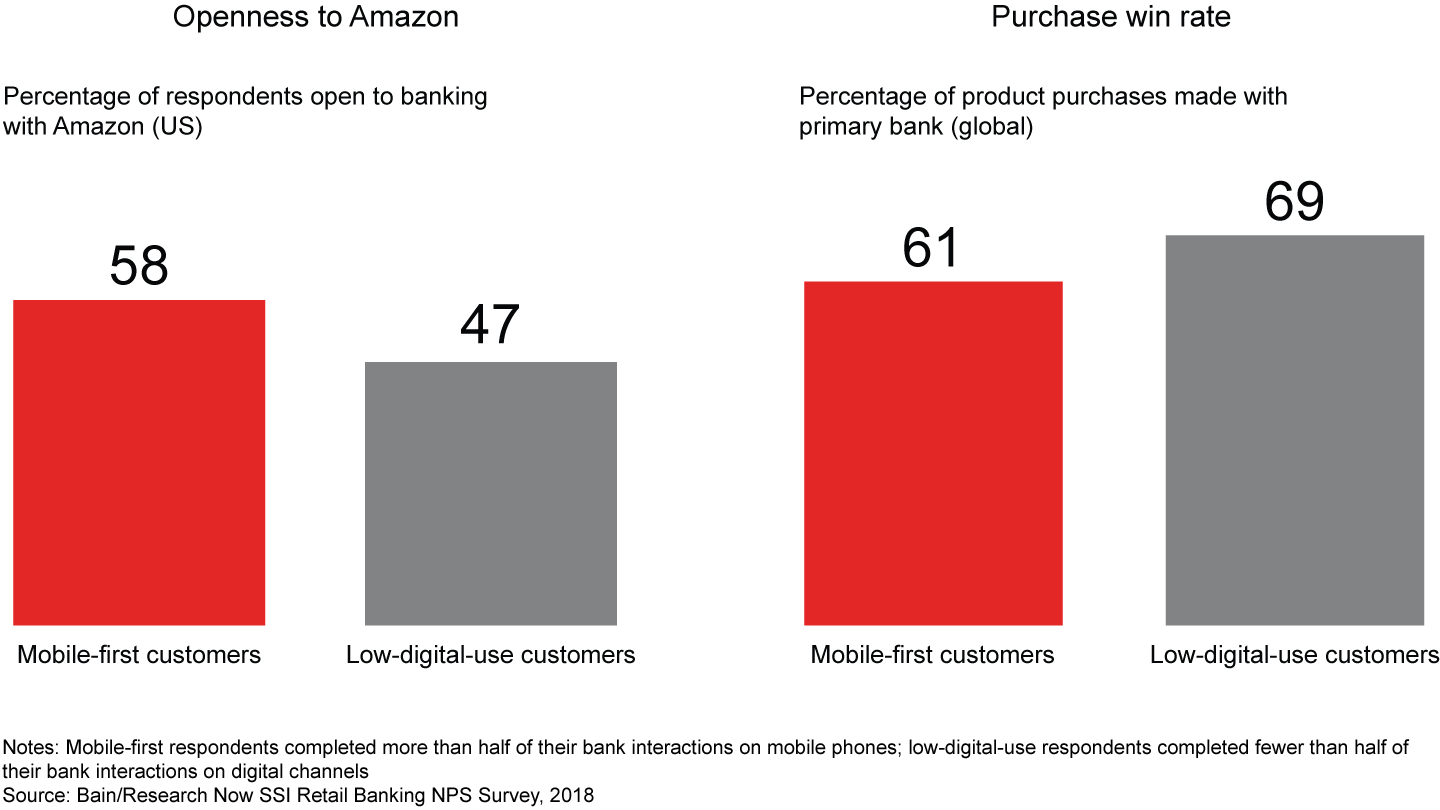 - Mobile-first customers in almost every country give higher loyalty scores to their primary bank than people with low digital behavior do—globally, almost 50% higher.