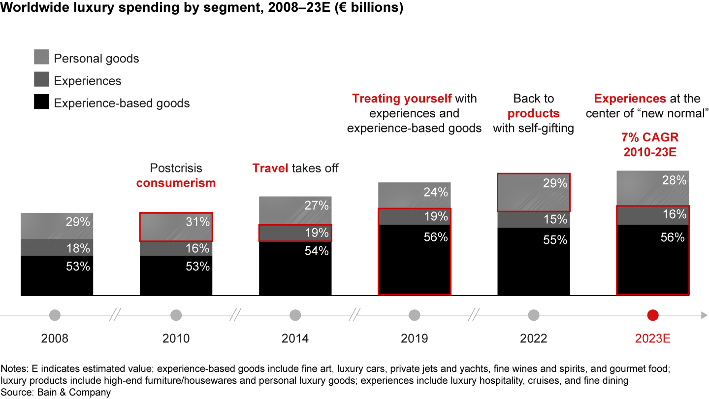 The overall luxury industry tracked by Bain & Company encompasses both luxury goods and experiences. It comprises nine segments, led by luxury cars, luxury hospitality, and personal luxury goods, which together account for more than 80% of the total market. The growth in total spending was consistent with the growth rate in 2022 and translated to a nearly €160 billion increment in spending across all luxury segments. In particular, spending on experiences recovered to historic highs, fueled by a resurgence in social interactions and travel.
