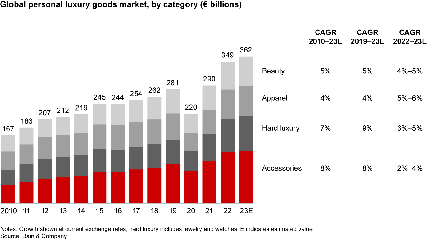 - All personal luxury goods categories grew in 2023, albeit at lower growth rates than in the last two years. Apparel and jewelry were the fastest-growing categories, both with a growth rate of 5% to 6% over 2022.