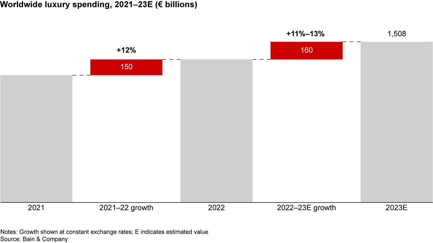 - The overall luxury market tracked by Bain & Company comprises nine segments: luxury cars, personal luxury goods, luxury hospitality, fine wines and spirits, gourmet food and fine dining, high-end furniture and housewares, fine art, private jets and yachts, and luxury cruises. Luxury cars, luxury hospitality, and personal luxury goods together account for 80% of the total market. We estimate that in 2023 the luxury market’s overall retail sales value grew to €1.51 trillion, an 11% to 13% increase over 2022 at constant exchange rates, in line with last year’s growth rate of 12% over 2021. All luxury segments grew and have finally closed the gap with pre–Covid-19 levels (including luxury hospitality, which has been the slowest to rebound). Since 2019, the Americas and Asia have been the two main sources of growth for overall luxury spending.