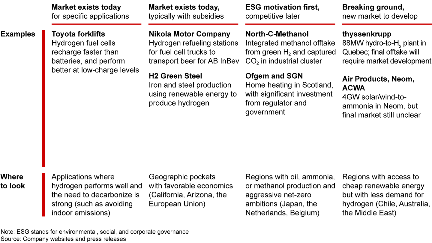 Much of the attention has focused on how to supply low-carbon hydrogen at prices competitive with gray hydrogen (made from fossil fuels) or other low-carbon energy sources, but customer demand will ultimately drive the market. Leaders start by developing a clear understanding of their customer’s needs, then figure out where hydrogen could make sense in filling them. This requires determining whether the cost of hydrogen can be competitive, given regional dynamics, regulatory incentives, and other low-carbon alternatives. Even when it cannot, some customers may be willing to pay more to meet their own sustainability goals.
