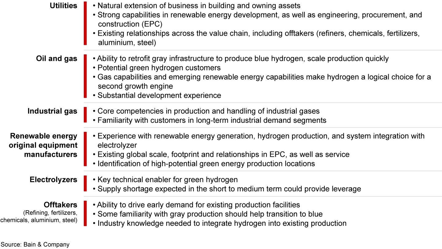 In the emerging hydrogen project consortia, companies are combining their strengths to complete the value chain. In many cases, oil and gas majors or utilities are taking on the role of project developer, with the output often used within refining, ammonia production, or blending into existing natural gas networks. Securing such offtake partnerships is critical for these early consortia, because a significant merchant market isn’t expected to develop before 2030. In the current project pipeline, some oil and gas companies are taking both the project developer and offtake roles.