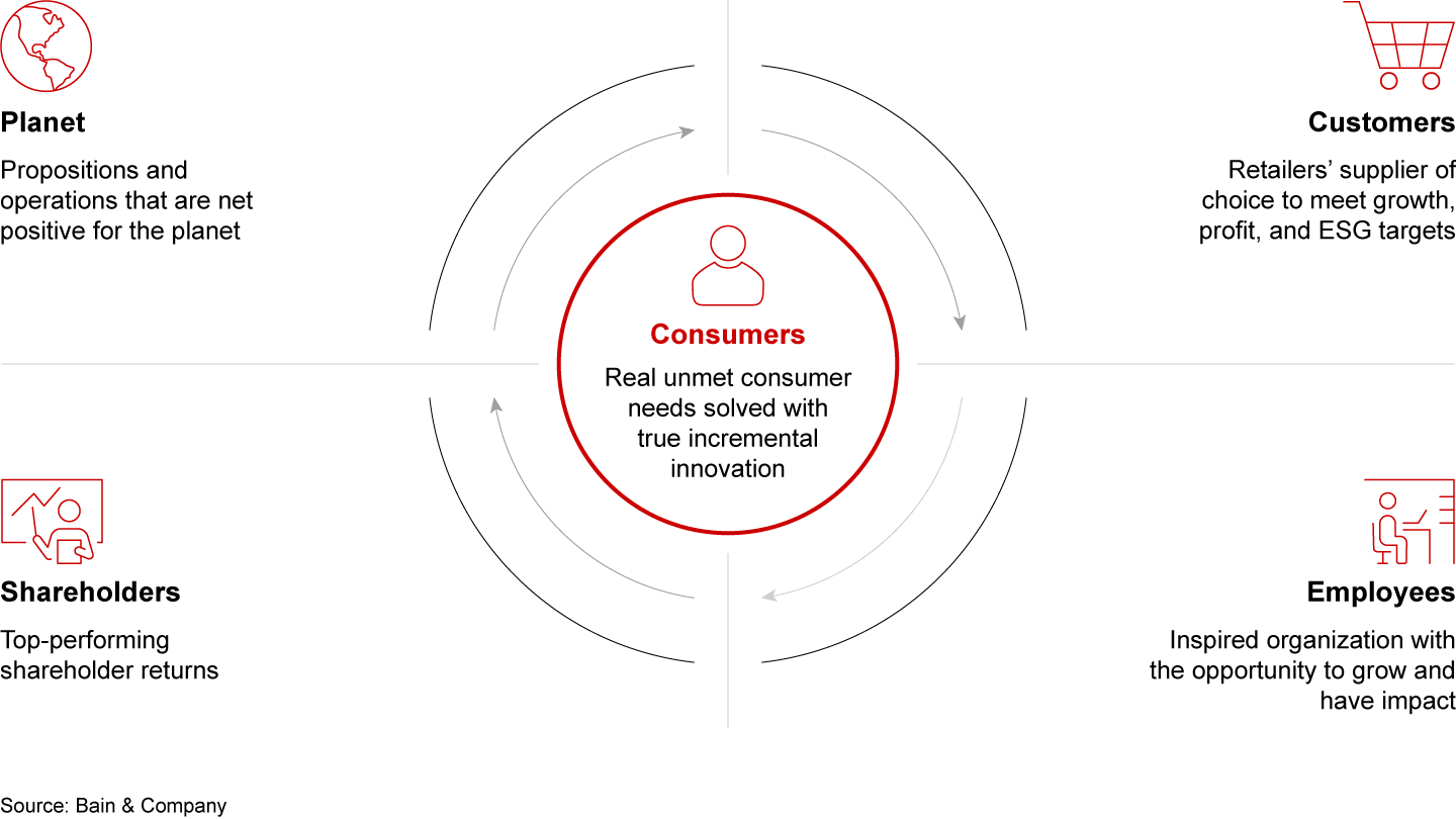 With the consumer products industry facing an uncertain macroeconomic future, companies that follow these five strategic imperatives for delivering value to all stakeholders will continue to outpace those that keep their eyes solely focused on shareholders. The challenge will be where to prioritize, how to fund, and how to energize the organization for this promising new agenda.