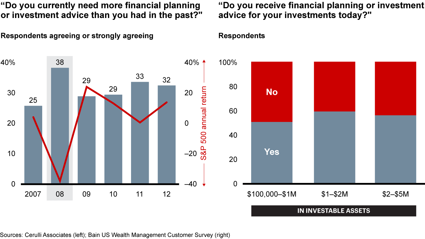 This period also presents an opportunity to reach underserved investors, as demand for advice tends to increase during periods of market turbulence. Roughly half of US investors with investable assets between $100,000 and $5 million do not have a financial adviser today, according to a recent Bain & Company survey of 1,200 investors. And half of those investors with advisers are not fully satisfied with the advice they receive (see Figure 1).