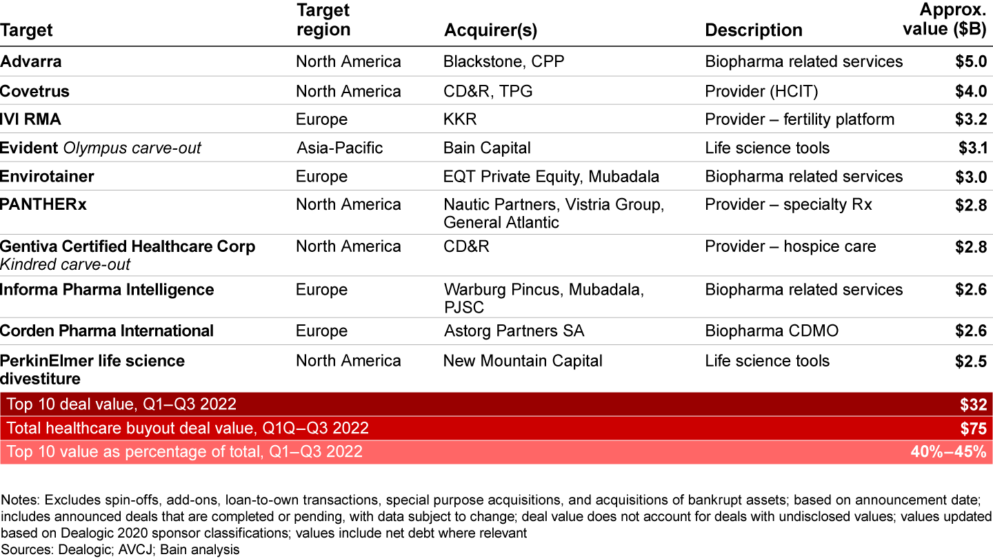 Seven of the top 10 deals were in biopharma, life sciences tools, and related services, demonstrating that PE funds found ways to mitigate the binary pipeline risk of biopharma assets, often by investing in organizations that provide products or services to a broad set of industry participants.