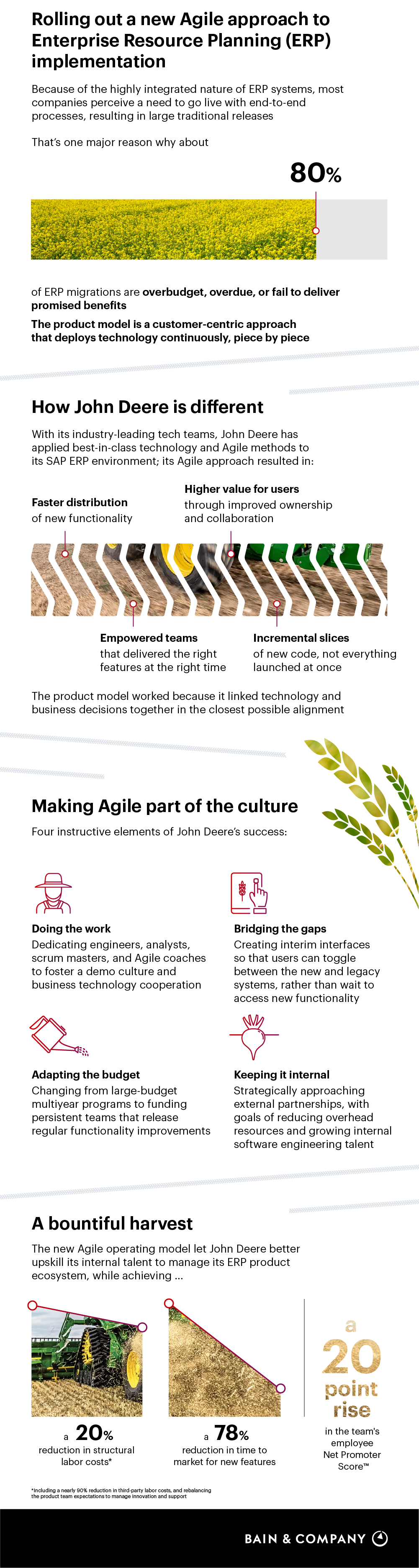 Infographic John Deere Reaps the Benefits of an Agile Software Upgrade By ditching the standard playbook for ERP migration the company was able to slash labor costs and time-to-market. By Steve Berez, Florian Braun, Brittany Matthews, Terry Goerdt, Josh Edgin, Siva Ganesh, and Amy Willard John Deere Reaps the Benefits of an Agile Software Upgrade Contacts Steve Berez Advisory Partner, Boston Florian Braun Partner, London Brittany Matthews Partner, Chicago Contact us Tags Advanced Digital Technologies for Industrials Advanced Manufacturing & Services Agribusiness Automotive CIO Insights Digital Enterprise Technology Machinery & Equipment Systems & Architecture