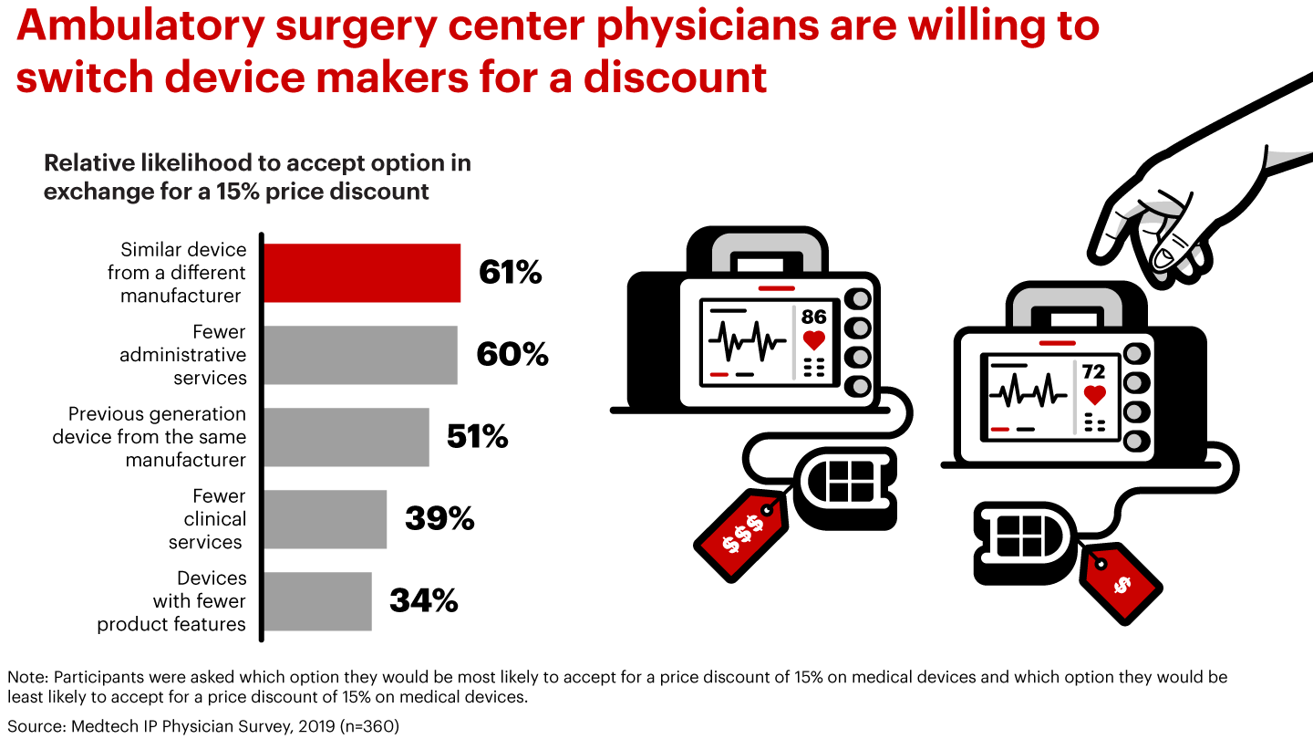 Ambulatory surgery centers (ASCs) are under constant pressure to reduce costs and improve efficiency, since payers reimburse them less than for the same procedure carried out in a hospital. The risk to manufacturers is that ASCs will have a greater propensity to switch to another device maker, if the price is right. Bain research shows that ASC physicians are more price-sensitive when purchasing medical devices and expect lower prices than hospitals pay for the same equipment, especially in orthopedics. Sixty percent of ASC physicians said they would purchase a similar device from a different manufacturer if it were offered at a 15% discount.