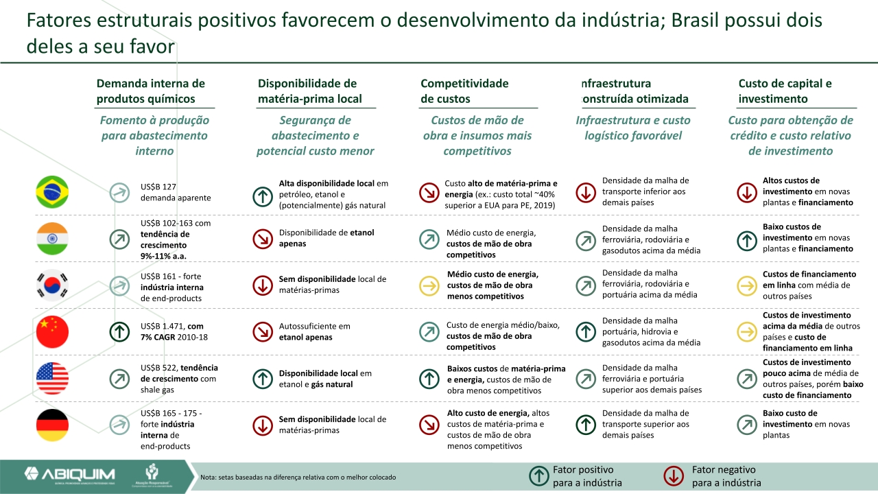 O Brasil está bem posicionado quanto a demanda interna e disponibilidade de matéria-prima local, mas, entre alguns dos países analisados, como China, EUA e Índia, ainda é o único a estar mal posicionado em competitividade de custos de produção, infraestrutura e custo de capital e investimento.