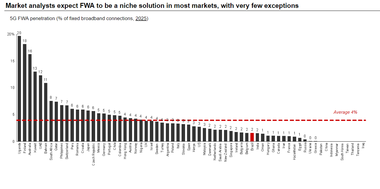 No Brasil, porém, a implementação do FWA é limitada atualmente, uma vez que as empresas de telecomunicações continuam a se concentrar na oferta de banda larga de fibra, que tem uma boa estrutura no país. Essa é uma das principais razões pelas quais não há grande aderência ao FWA por aqui, mesmo com a abertura da banda de 6GHz para WiFi não licenciado e acesso sem fio realizada pela Anatel em 2021. A adoção do FWA no mercado brasileiro depende de sua capacidade de oferecer uma proposta de valor mais atrativa do que a fibra, que conta hoje com baixos custos de mão-de-obra, uso de fibra óptica aérea e componentes chineses que barateiam os investimentos no setor.