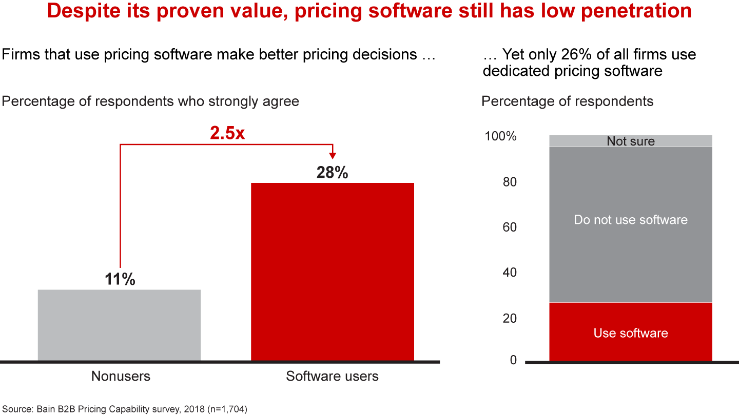 Most B2B companies can raise their game by adopting pricing software tools. For example, based on the performance of historical deals, software solutions can provide frontline sales representatives with real-time pricing feedback on the characteristics of a deal underway. Whether in-house or from a provider such as Vendavo or Price f(x), using dedicated pricing software is associated with 2.5 times stronger pricing outcomes, according to Bain & Company’s analysis of a survey of senior executives at 1,700 companies. Yet despite the proven value of pricing software, it still has only 26% penetration among the respondents.