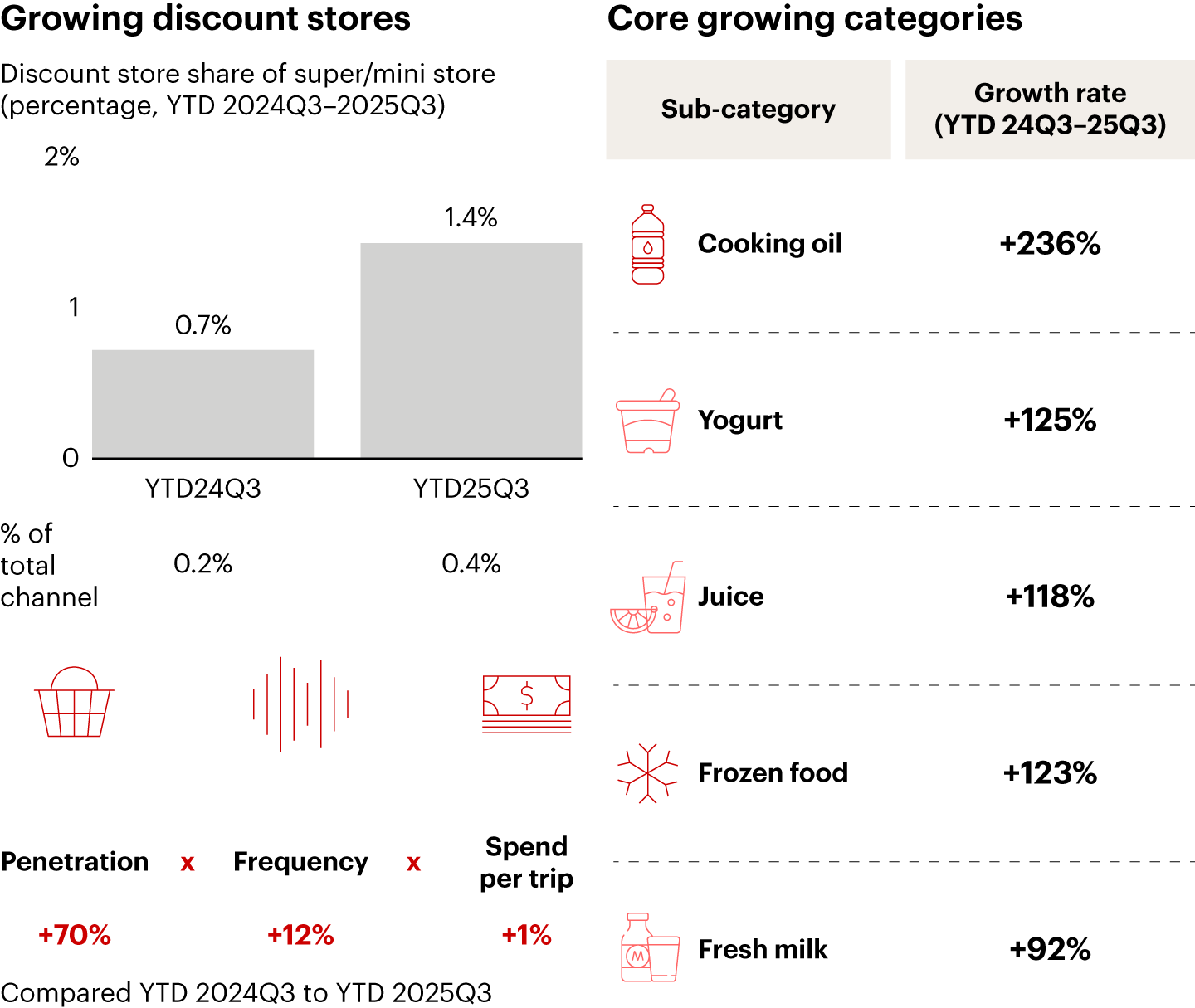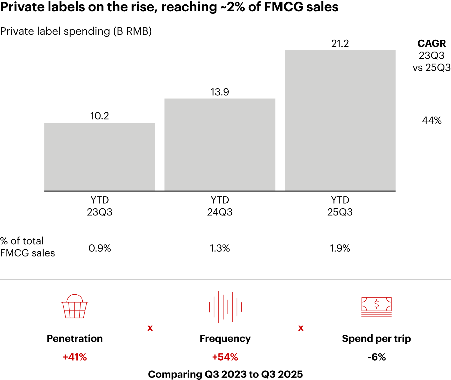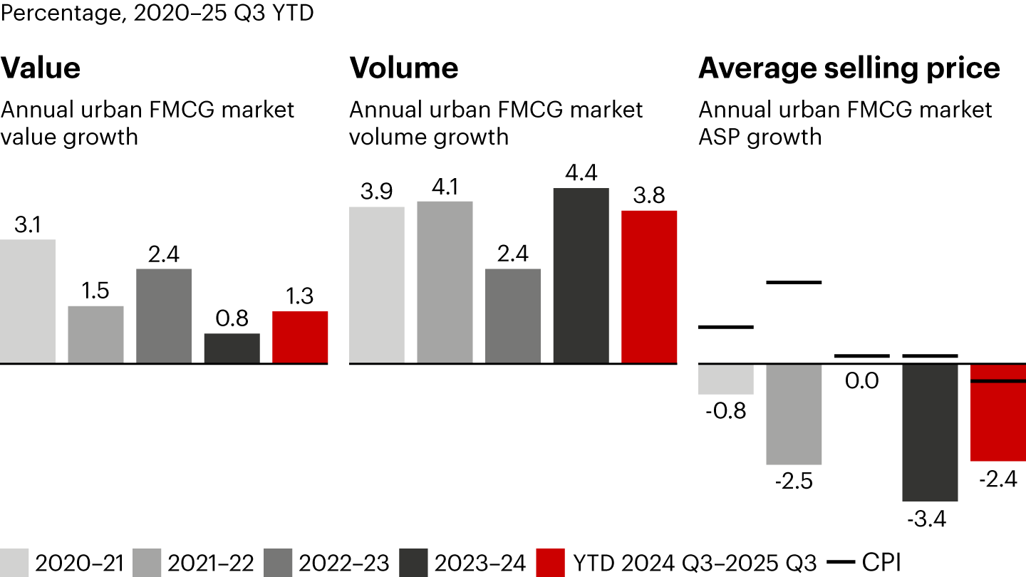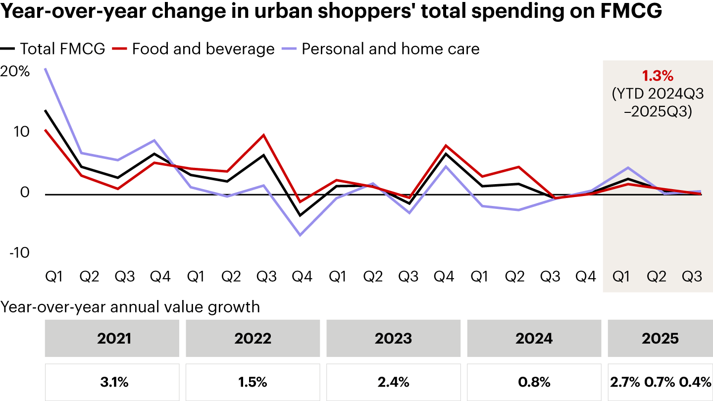 Notes: FMCG is fast-moving consumer goods; Worldpanel updated the consumer universe in 2022 and 2023, leading to some inconsistencies with previous years‘ data; YTD 2024 Q3 refers to 30 Dec 2023 to 6 Sep 2024; YTD 2025 Q3 refers to 28 Dec 2024 to 5 Sep 2025