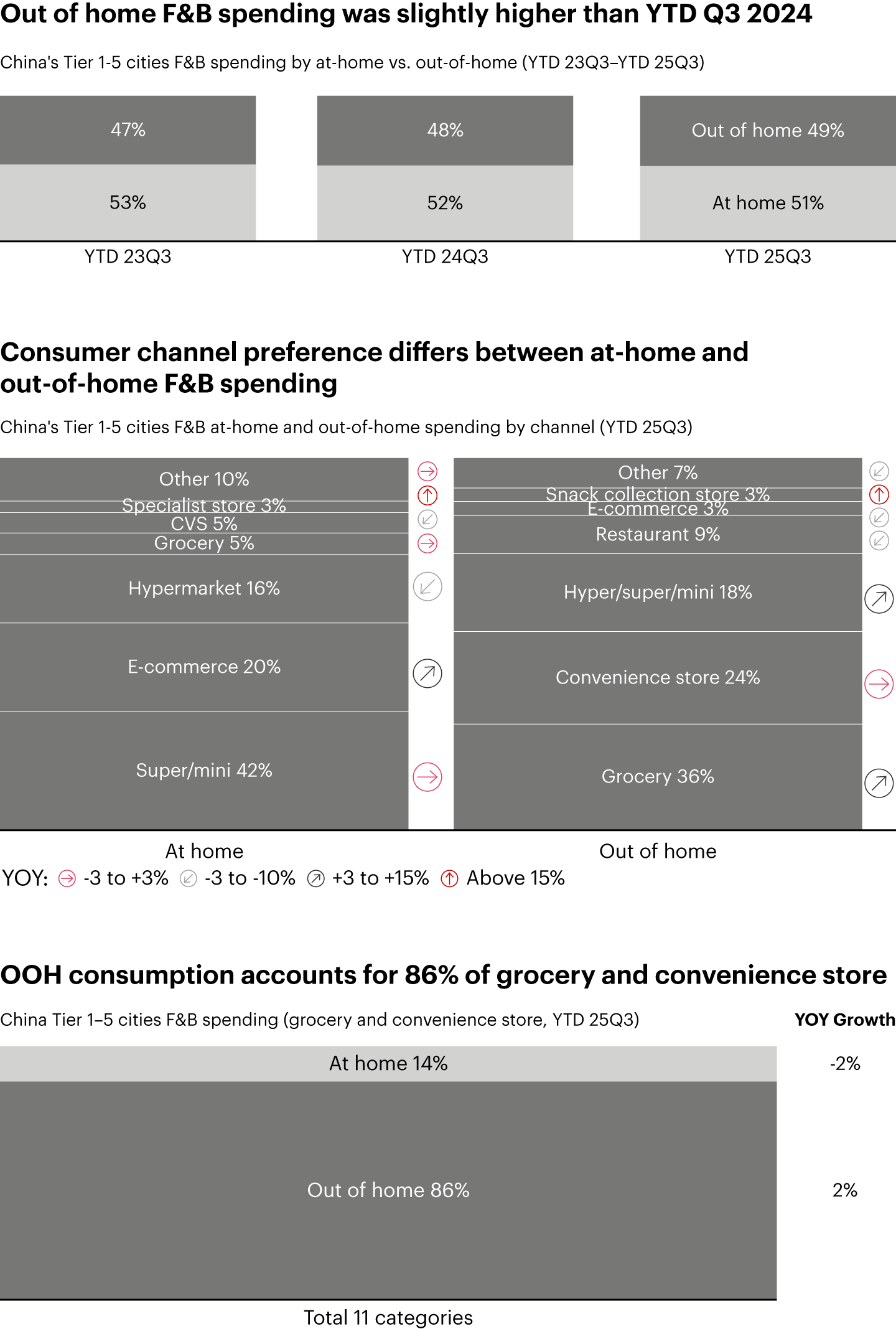 At-home vs. out-of-home: For 11 food and beverage categories that we track in both at-home and out-of-home (OOH) channels, OOH consumption continued to gain share in YTD 2025 Q3, with its share edging up to 49% (+1 ppt vs. YTD 2024 Q3) (see Figure 19). The recovery was led by grocery, convenience stores, and hypermarkets/supermarkets/mini-stores, which captured 78% of total OOH sales. Meanwhile, at-home consumption remained stable: E-commerce sustained modest gains while offline formats such as supermarkets, mini-stores, and hypermarkets came under continued pressure.
