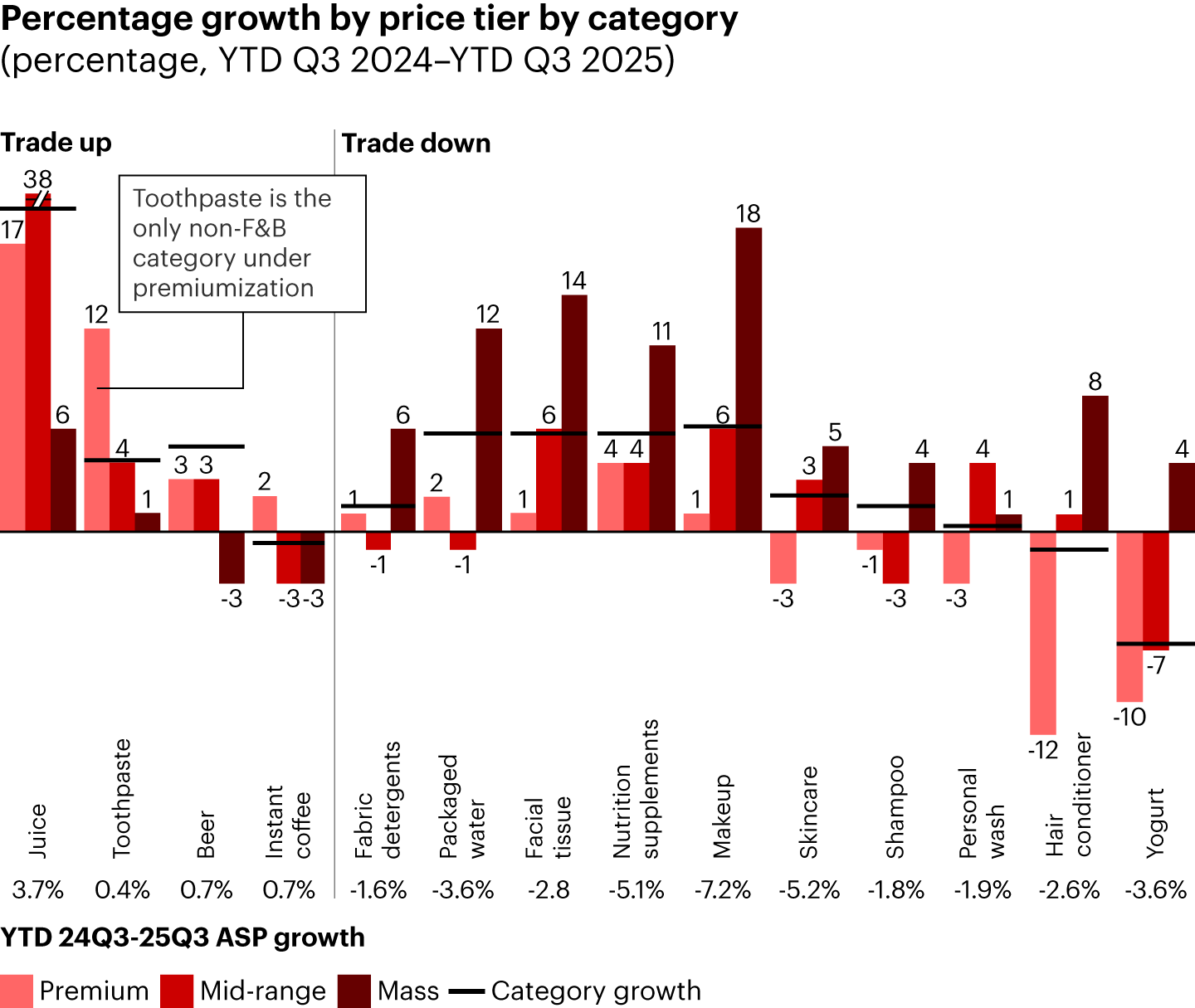 Amid the commonly observed price deflation, select categories still maintained momentum toward premiumization. Juice stands out as a clear example, while other food and beverage categories such as chocolate also posted upward trading. Toothpaste, the only non-food category, continued its steady premiumization trend (see Figure 10).