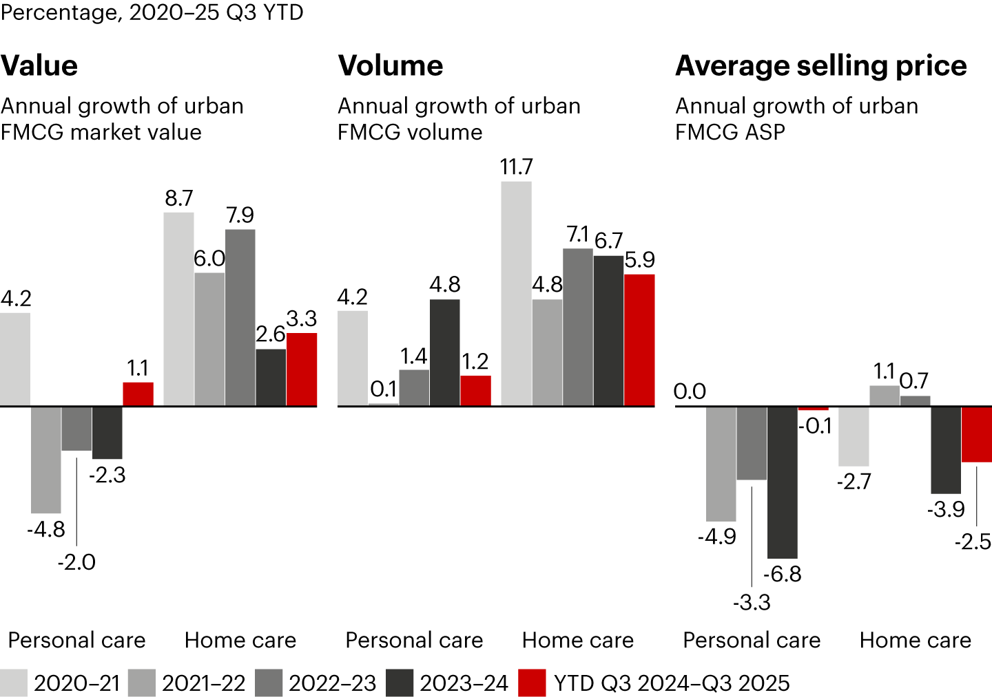 Across sectors, packaged food (+3.4%) and home care (+3.3%) led market growth, while personal care (+1.1%) saw modest gains and beverages (-1.1%) turned negative in Q2 and Q3 amid rising price competition and increasing substitution by freshly made drinks.