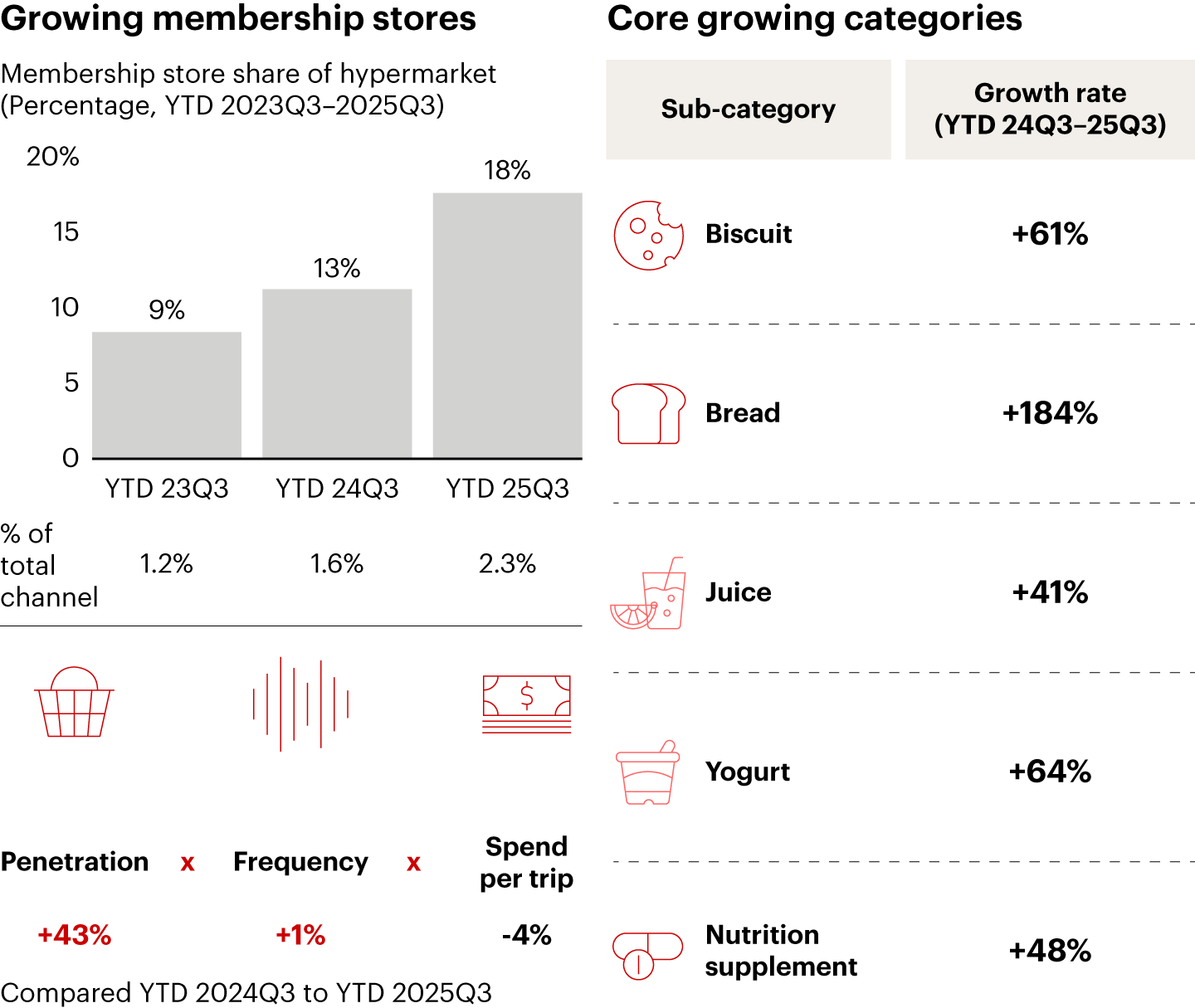 Membership stores have grown to become a significant and rapidly expanding segment, with their share rising from 1.6% in YTD 2024 Q3 to 2.3% in YTD 2025 Q3 in total FMCG sales, now accounting for around 18% of hypermarket sales (see Figure 12). This growth has been driven by strong gains in consumer penetration (+43%) and a modest uptick in purchase frequency (+1%), partially offset by a −4% decline in spending per trip. Top-growing categories include biscuits (+61%), bread (+184%), juice (+41%), yogurt (+64%), and nutrition supplements (+48%). The segment is led by Sam’s Club and Costco, which continue expanding their urban footprints to target upper-middle-class and affluent families valuing both quality and affordability, catering to regular household purchases with delivery service and stockpiling needs. Both retailers are also expanding their private-label portfolios, positioning them as high-quality, high- value alternatives that reinforce loyalty and differentiate their assortments from traditional hypermarkets.
