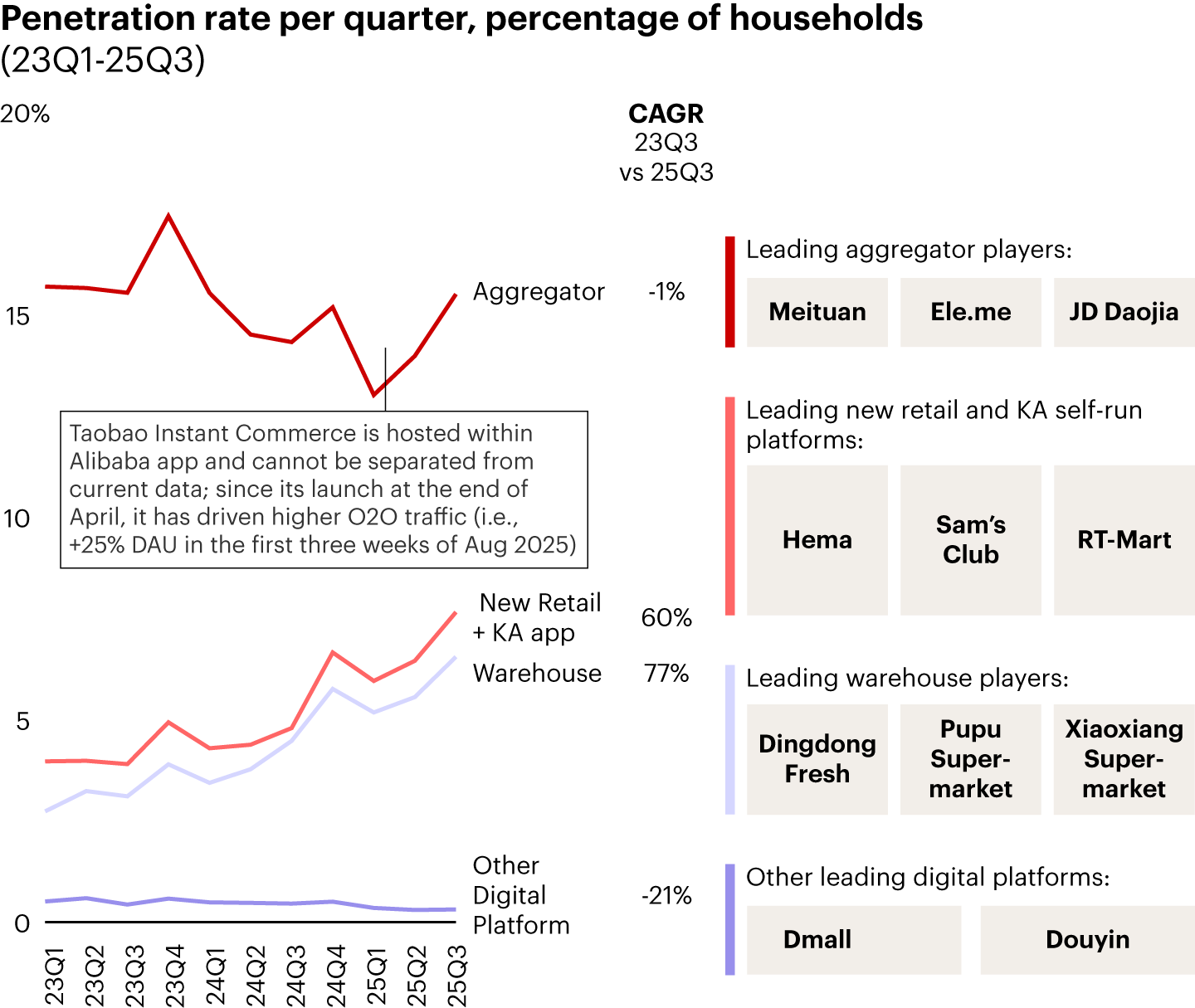 New retail/KA self-run platforms and warehouses have maintained rapid penetration growth and aggregators have rebounded from a decline
