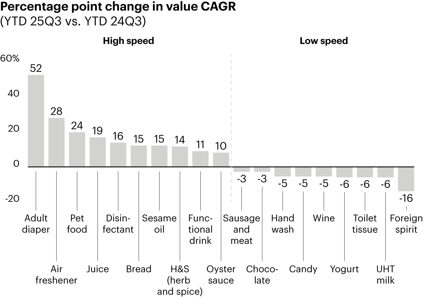Two-speed phenomenon: In 2025 YTD, the two-speed phenomenon persisted in the FMCG market (see Figure 7). Fast-growing categories are now increasingly related to hygiene or in-home cooking such as sesame oil, herb and spice sauces, juice, and functional drinks, with growth mainly driven by volume. Carryover outperformers such as sesame oil and juice remained among the most resilient growth engines, sustaining strong momentum from prior years and further reinforcing consumers’ shift toward health and wellness.