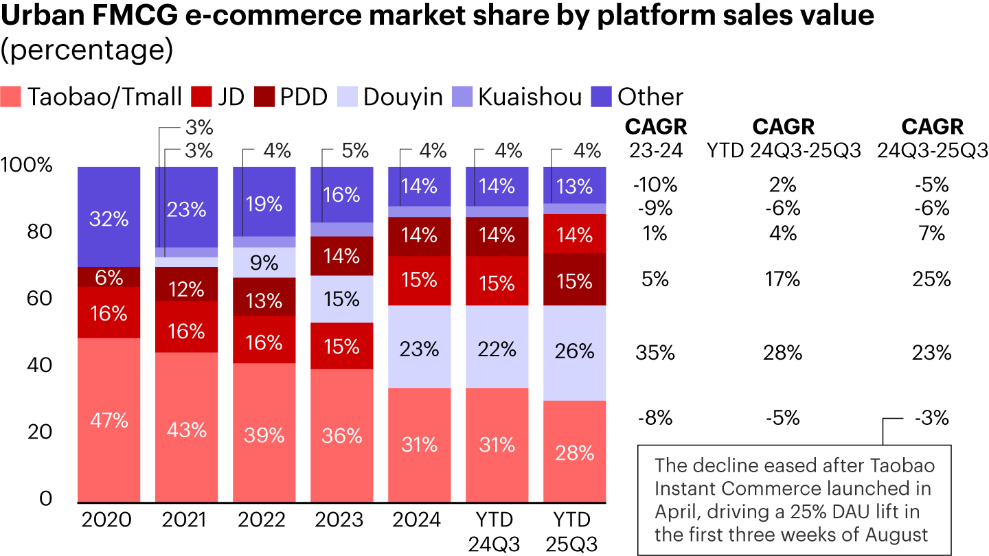 Value-focused platforms also accelerated. Pinduoduo (拼多多) strengthened its leadership in affordable FMCG and surpassed JD.com (京东) to become the third-largest platform (15% vs. JD’s 14%), supported by competitive pricing, efficient fulfillment, and higher purchase frequency.