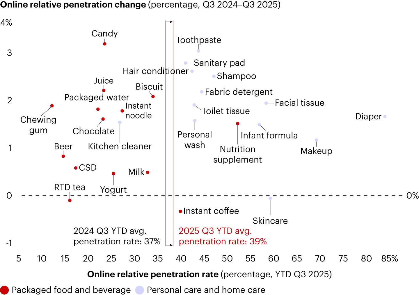 Online penetration increased in nearly all categories in YTD 2025 Q3, with two distinct clusters around F&B and personal care/home care