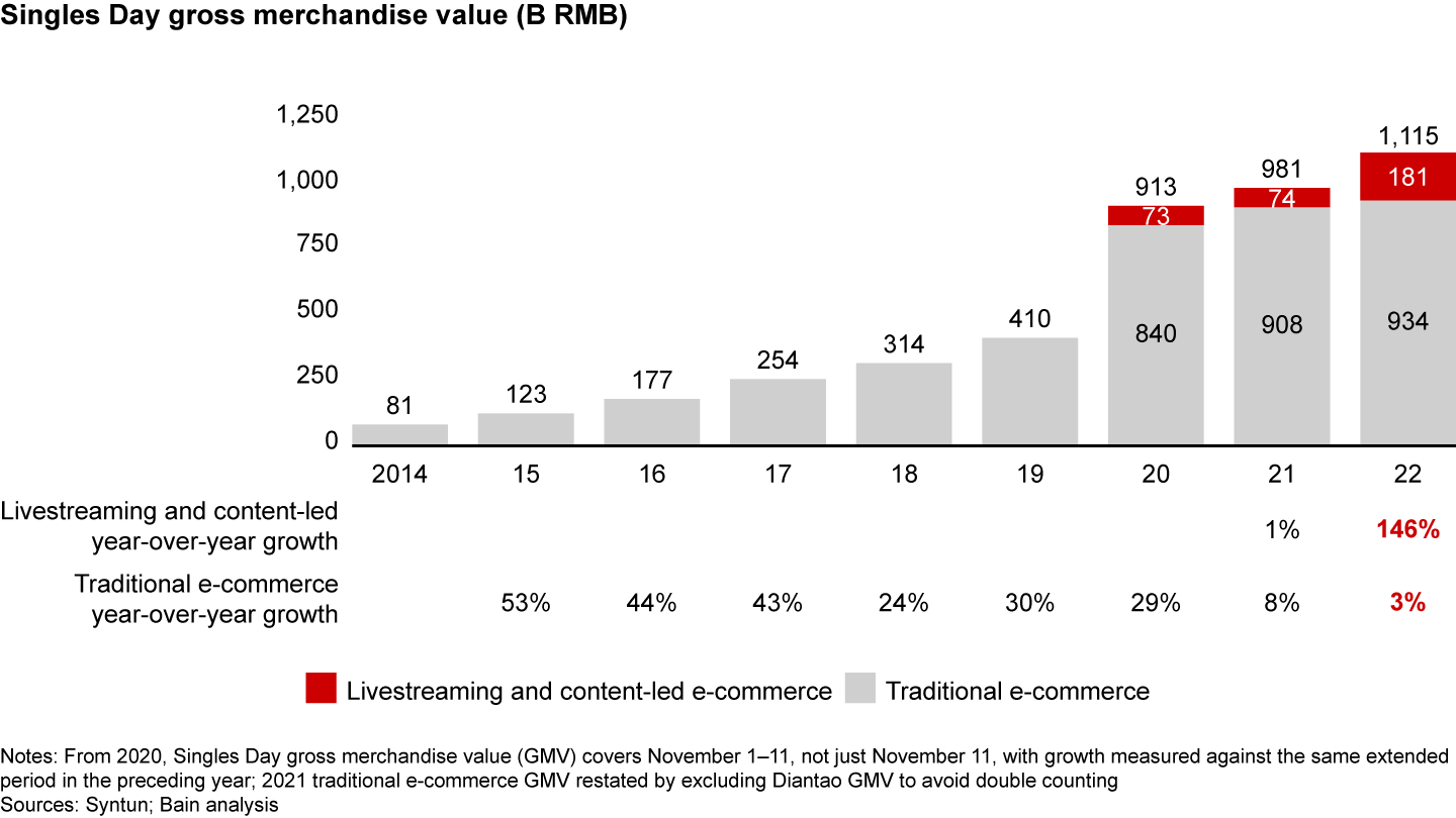 The rise of livestreaming—which typically consists of an influencer promoting one or more products in an entertaining broadcast that also facilitates purchases by viewers—was already visible on Singles Day last year. In the report we published before the 2022 festival, we questioned whether the gross merchandise value (GMV) of products flowing through traditional e-commerce platforms on Singles Day and the preceding promotional period would necessarily hit RMB 1 trillion, even though this sales milestone was almost reached in 2021.