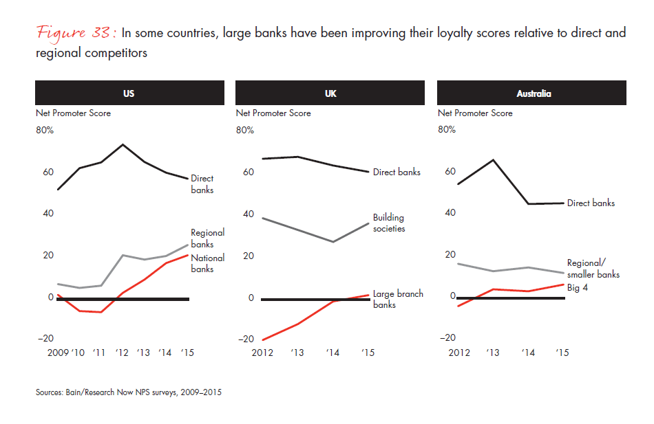 - Large traditional banks continued to make meaningful improvements in their Net Promoter Scores relative to direct or smaller competitors. That change was most pronounced in the US and UK.