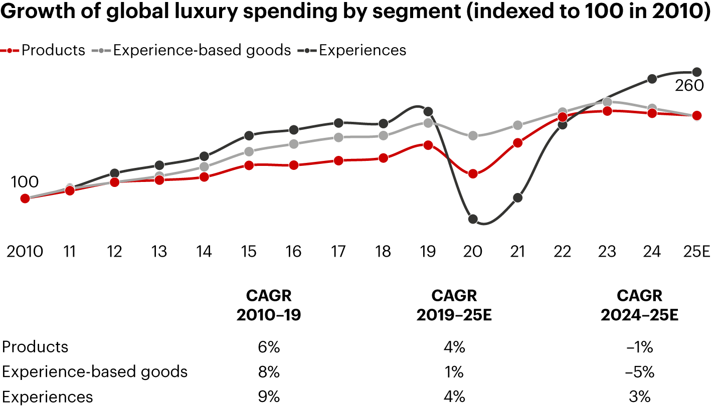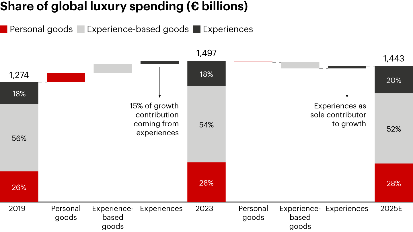 Notes: Growth shown at current exchange rates; E indicates estimated growth; experience-based goods include luxury cars, fine art, private jets and yachts, fine wines and spirits, and gourmet food; experiences include luxury hospitality, cruises, and fine dining; personal goods include high-end furniture/housewares and personal luxury goods