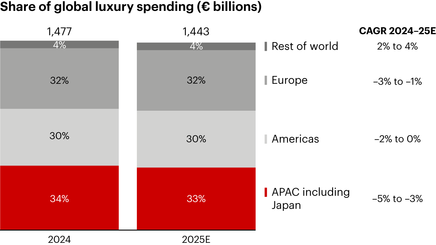 - Excluding mainland China and Japan, Asia-Pacific sales remained broadly stable in 2025, with growth ranging between a decline of 1% and an increase of 1% at current exchange rates. South Korea showed early signs of improvement, supported by favorable currency dynamics and Chinese travelers, though domestic sentiment remained cautious. Hong Kong continued to regain appeal, attracting younger Chinese tourists and a growing ultra-high-net-worth population. Southeast Asia delivered a mixed performance: Thailand lagged, Singapore, and Indonesia held steady, while Vietnam and the Philippines showed strong potential as luxury awareness continued to rise.