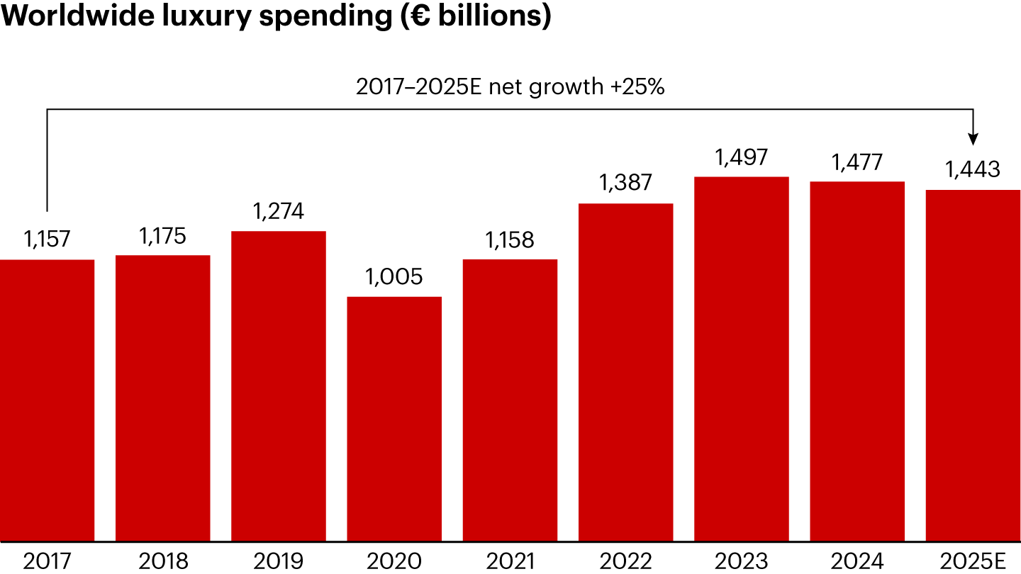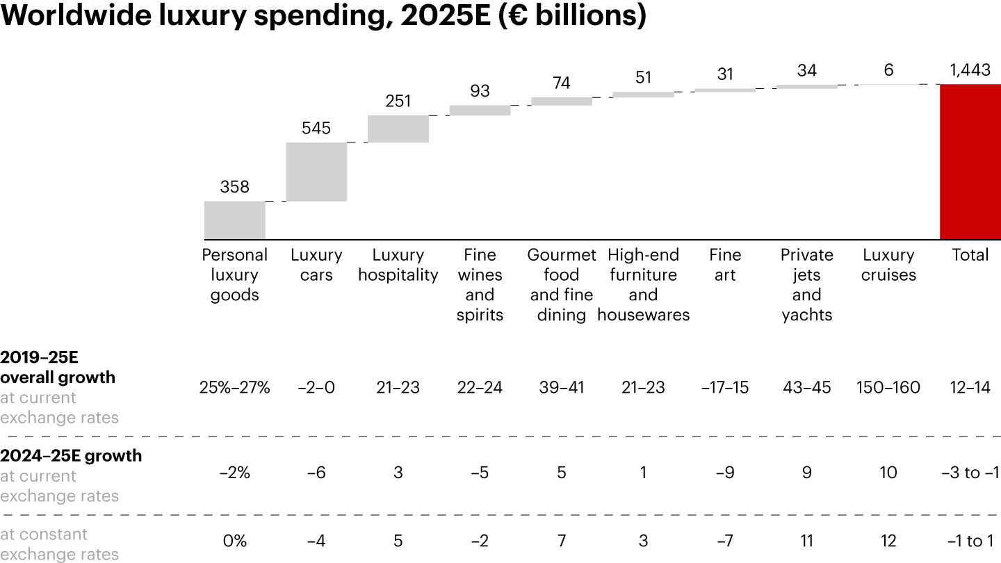- The overall luxury market tracked by Bain & Company comprises nine segments: luxury cars, personal luxury goods, luxury hospitality, fine wines and spirits, gourmet food and fine dining, high-end furniture and housewares, fine art, private jets and yachts, and luxury cruises. Luxury cars, luxury hospitality, and personal luxury goods together account for 80% of the total market. Overall, we estimate that in 2025 luxury spending remained relatively flat at €1.44 trillion in retail sales value, with the final growth rate likely to fall between a decline of 1% and an increase of 1% over 2024 at constant exchange rates. The segments that recorded the strongest growth were all experience related.