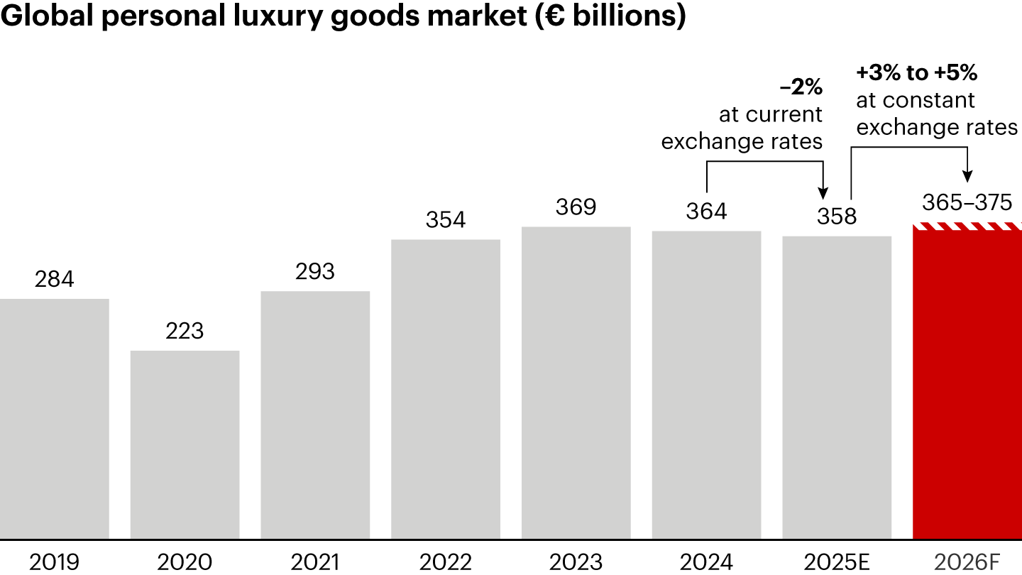 - In 2026, the personal luxury goods market is expected to return to moderate expansion, with the most plausible scenario pointing to growth of 3% to 5%. This forecast assumes sustained momentum in the US supported by robust financial markets, continued resilience in Europe and in Japan’s local demand, and steady recovery progress in China.